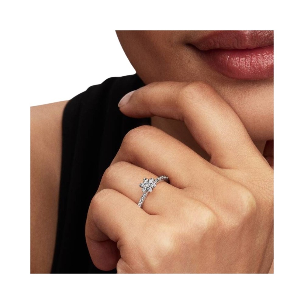 La delicatezza dei fiori si veste di splendore. Realizzato in Argento Sterling 925, questo anello presenta un fiore in rilievo ornato da pietre incolori e una fascia decorata per metà da pavé. Un gioiello luminoso che esalta qualsiasi look.