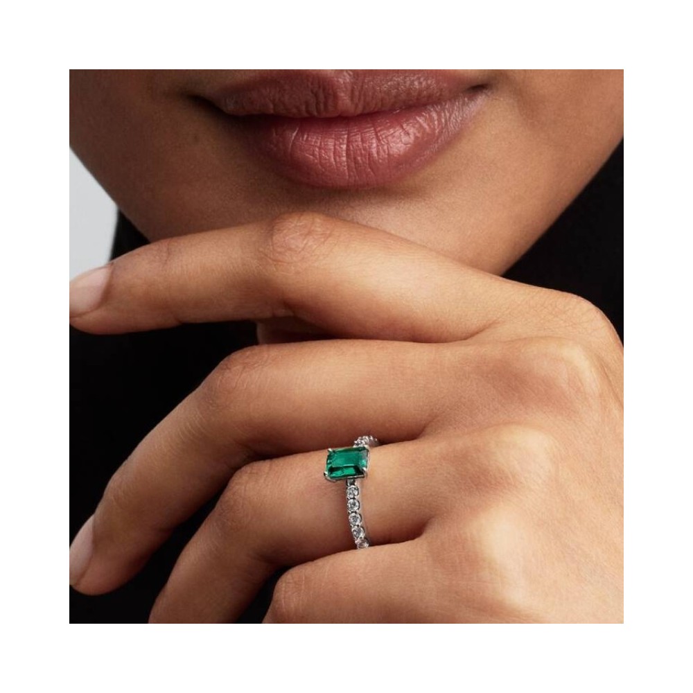 Attira ogni sguardo. Questo anello in Argento Sterling 925 presenta un cristallo creato dall'uomo verde in rilievo con una fascia decorata per metà da pavé ed è ispirato ai preziosi ricordi nascosti nei portagioie di un tempo.