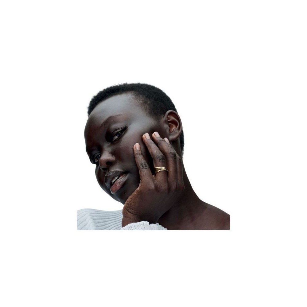 Tre fasce leggermente ondulate dal profilo arrotondato, con placcatura Oro 14k, si sovrappongono l’una all'altra creando uno spazio intermedio. Dal design minimal e scultoreo che riprende le linee sinuose della natura, il gioiello si caratterizza per la sua semplicità e asimmetria. L'anello non si chiude completamente e lascia un piccolo spazio sotto il dito Nota: l'anello non è regolabile per dimensioni; non modificare il design tentando di stringerlo o schiacciarlo.