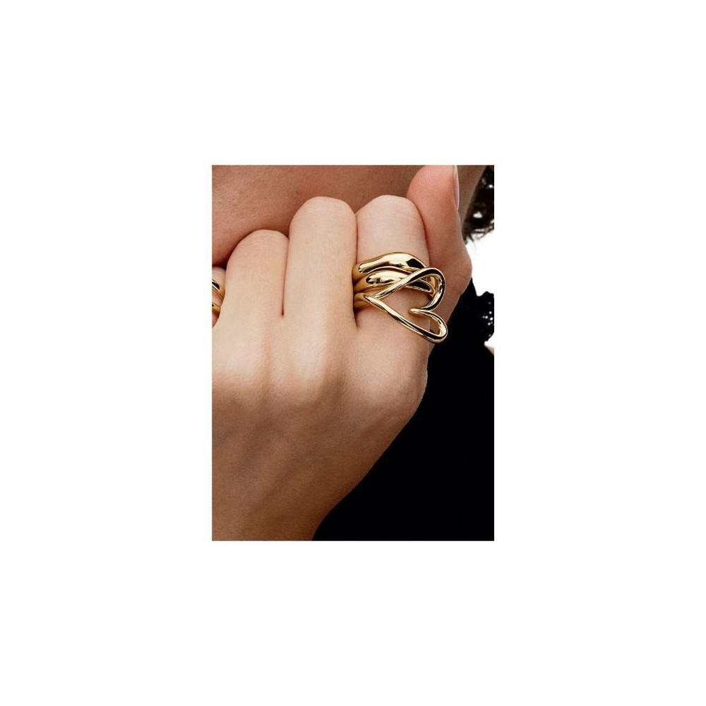 La fascia placcata oro 14k presenta una delicata ondulazione che crea un cuore dalla forma imperfetta. Solo il centro del cuore tocca il dito, mentre il resto dell'anello è sollevato. Un anello scultoreo, elegante e moderno