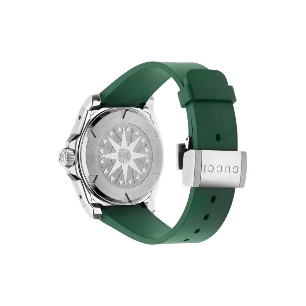 La linea Gucci Dive continua a reinterpretare i codici della Maison in modi contemporanei. Caratterizzato da una cassa in acciaio e un cinturino in gomma, questo orologio presenta un quadrante verde con l'emblematico logo Incrocio GG.