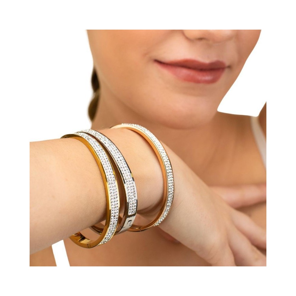 Bracciale rigido rodiato con tre file di inserti di strass.Dimensioni: Diametro ovale 5,8 cm x 5 cm; spessore 0,7 cm.Chiusura: Chiusura a scatto.