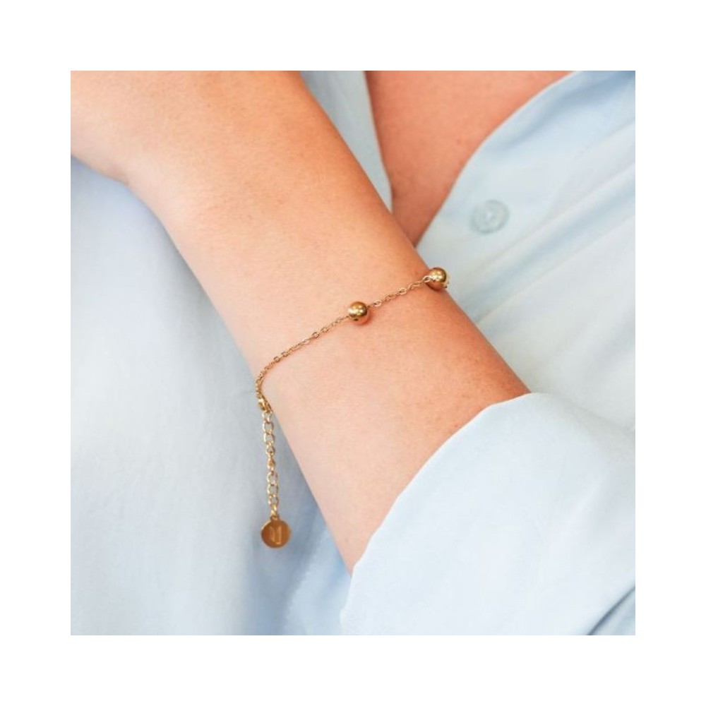 Bracciale in acciaio placcato oro giallo con centrale composto da 3 intercalari a forma di boules.Misura: lunghezza cm 16 estendibile fino a cm 19Dimensione: boule cm 1x1Chiusura: con moschettone