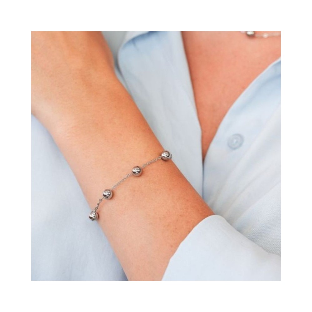 Bracciale in acciaio rodiato con centrale composto da 5 intercalari a forma di boules.Misura: lunghezza cm 16 estendibile fino a cm 19Dimensione: boule cm 1x1Chiusura: con moschettone