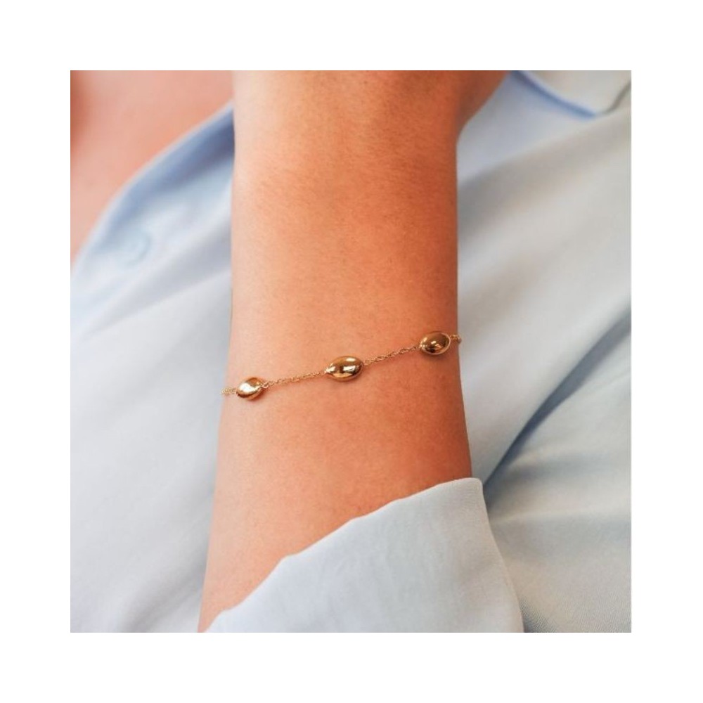 Bracciale in acciaio placcato oro giallo con centrale composto da 3 intercalari a forma di chicco di riso.Misura: lunghezza cm 16 estendibile fino a cm 19Dimensione: chicco cm 1x0,5Chiusura: con moschettone