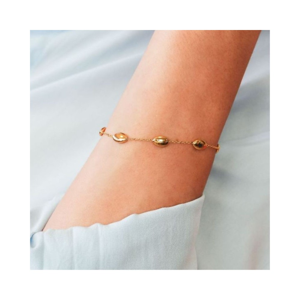 Bracciale in acciaio placcato oro giallo con centrale composto da 5 intercalari a forma di chicco di riso.Misura: lunghezza cm 16 estendibile fino a cm 19Dimensione: chicco cm 1x0,5Chiusura: con moschettone