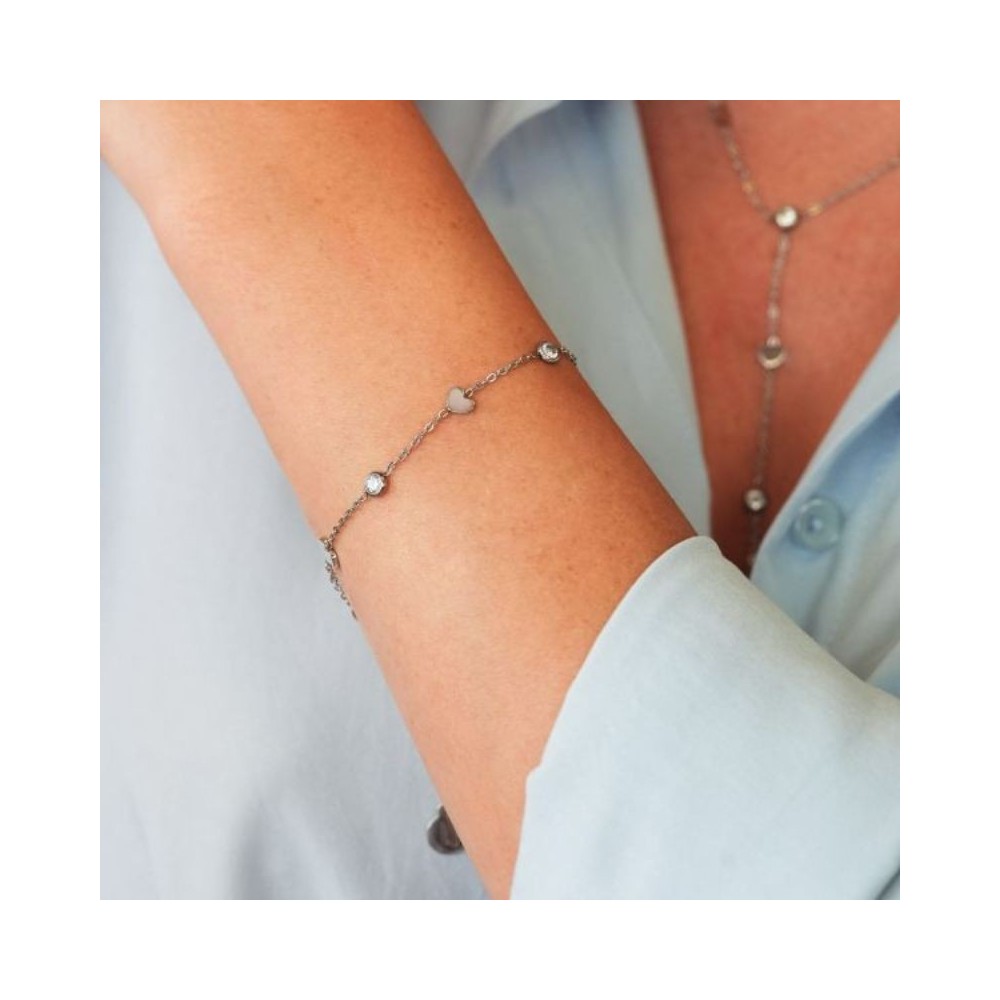 Bracciale in acciaio rodiato con ciondoli a forma di cuore alternati a cristalli circolari di colore bianco.Misure: lunghezza da cm 17 a cm 20Dimensione: diametro cuore-cristalli mm 4