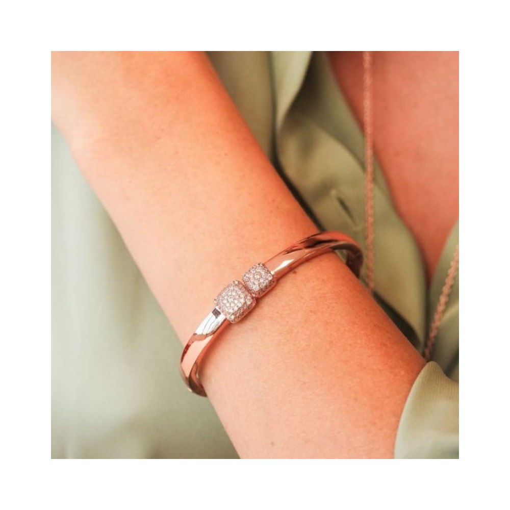Bracciale rigido placcato oro rosa con doppio quadrato centrale in pavè di zirconi e chiusura a molla.Misura: diametro interno cm 5,8Dimensione: centrale mm 10x10 e mm 8x8Chiusura: a molla