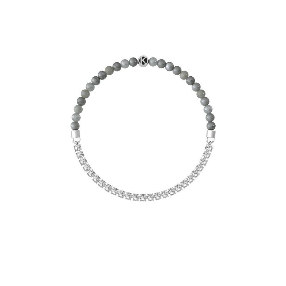 Bracciale elastico in acciaio con sfere di agata grigia satinata e tennis di zirconi bianchi.