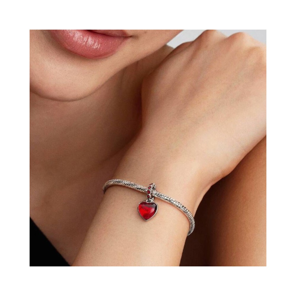 Un regalo che viene dal cuore. Questo charm in Argento Sterling 925, presenta un pendente in vetro di Murano rosso intenso e un secondo pendente con l'incisione YOU ARE MY SOULMATE (SEI LA MIA ANIMA GEMELLA). Decorato da cristalli rossi, è perfetto per celebrare l'amore e i legami profondi.