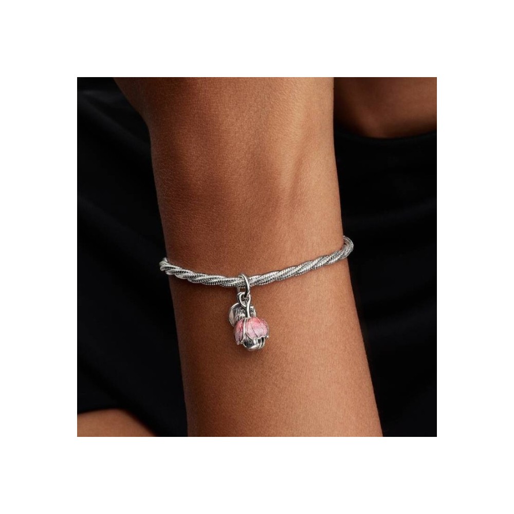 Sboccia con gratitudine. Questo Charm pendente fiore in Argento Sterling 925 si apre su tre petali stratificati con un centro rifinito in oro e presenta un cristallo verde creato dall’uomo e resina rosa scintillante; il tutto è completato dall'incisione Thank you sul disco.
