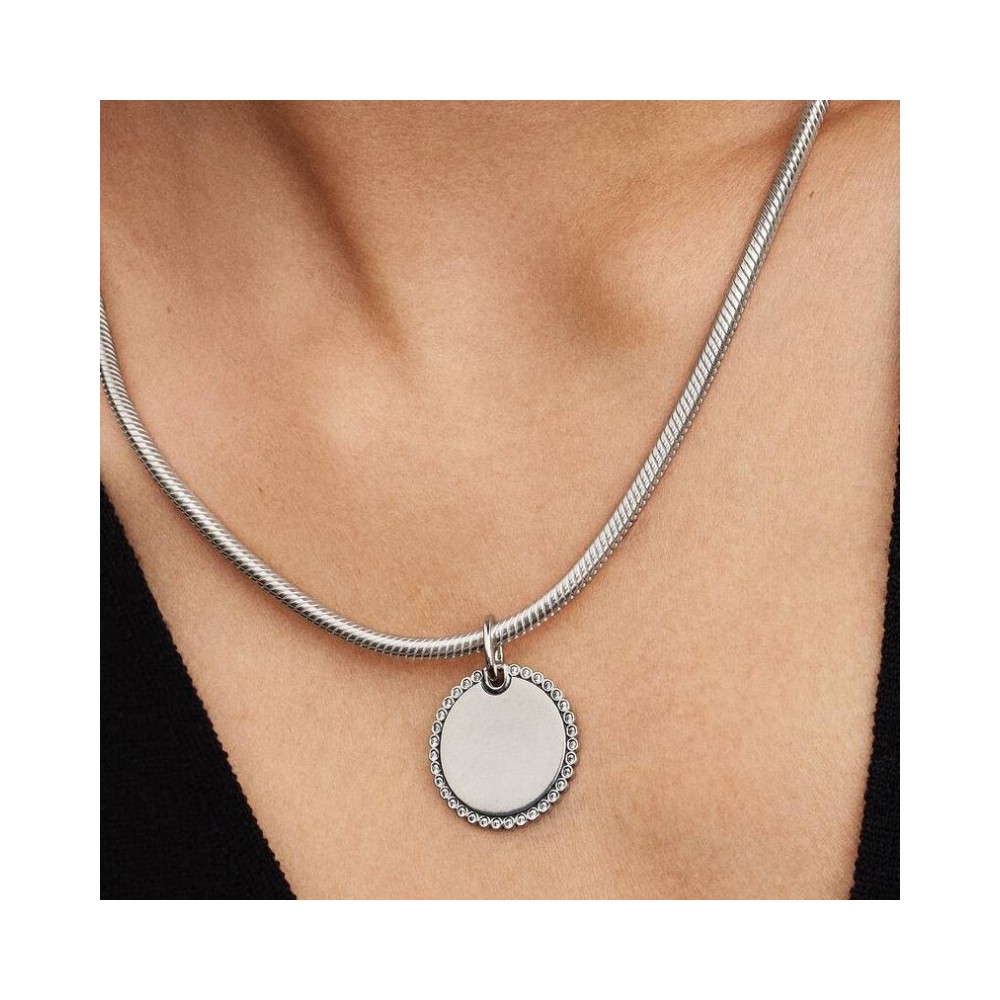 Uno stile minimalista che fa la differenza. Aggiungi alla tua collezione il nuovo pendente medaglia luminosa da incidere in Argento Sterling 925, circondato da un'aureola di pietre scintillanti.