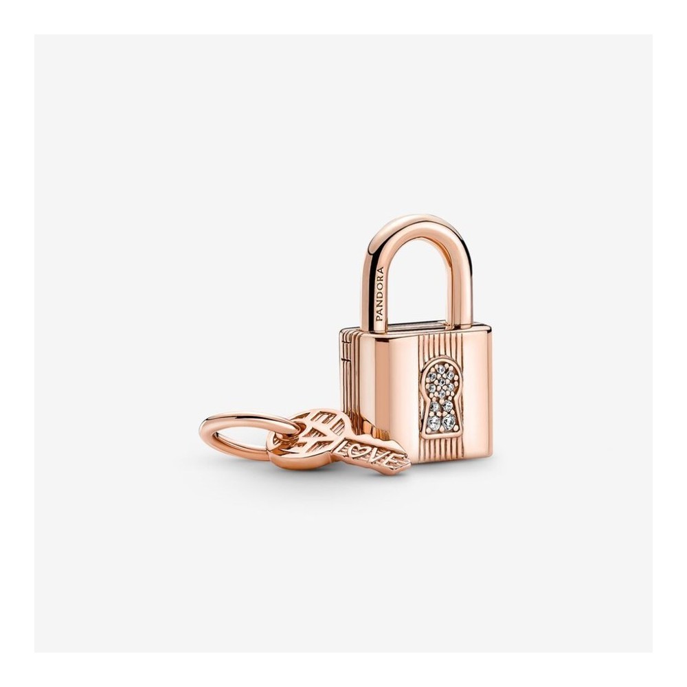 Charm pendente Lucchetto e chiave. Il gioiello è diviso in due parti e anche la chiave costituisce un charm a parte. Posizionala accanto al lucchetto e inserisci entrambi su un gioiello che ami oppure regala la chiave a una persona cara che così sarà l’unica a poter aprire il lucchetto. Ispirato ai lucchetti fissati sui ponti dagli amanti in tutto il mondo, questo charm pendente Lucchetto e chiave con placcatura in oro rosa 14k è il modo perfetto per esprimere il tuo amore