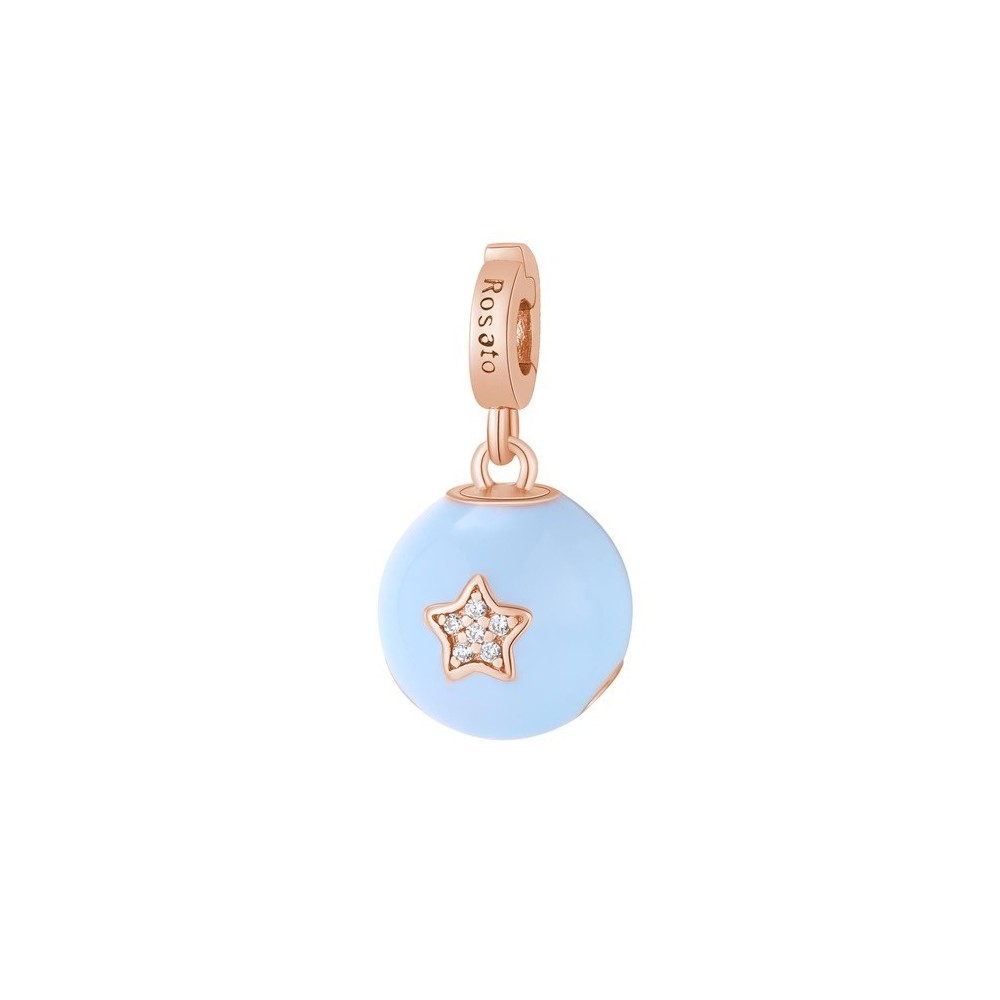 Charm pendente Rosato collezione Storie in argento 925 ‰ placcato in oro rosa e smalto celeste a forma di campanellino con pietre di zirconia cubica bianche.