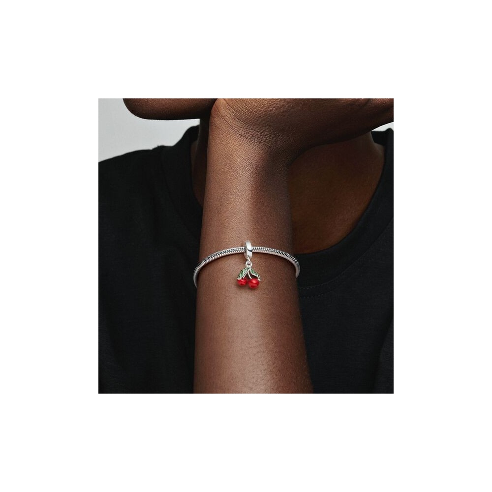 Aggiungi questo charm con ciliegia al tuo look per un vivace tocco di colore. Realizzato in argento sterling, questo ciondolo fruttato presenta un paio di ciliegie rosse mature con dettagliate foglie verdi rifinite a mano in smalto trasparente.