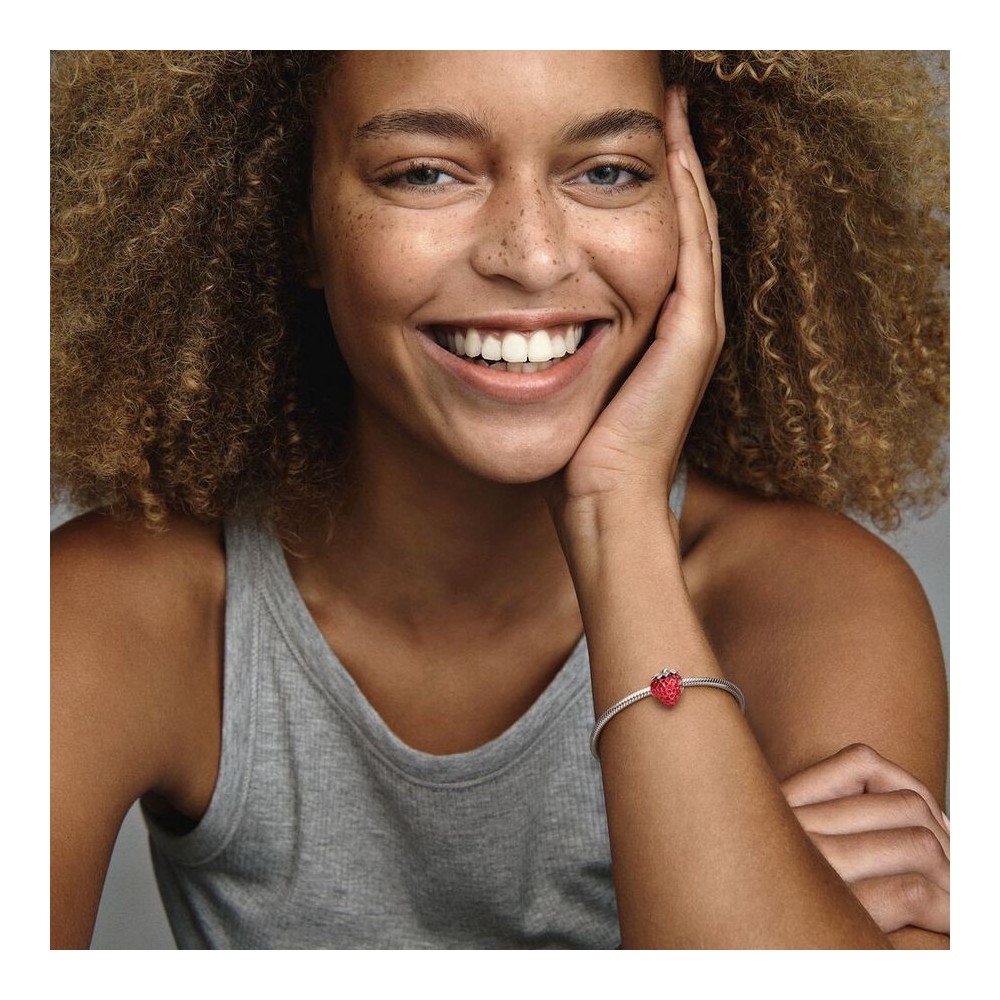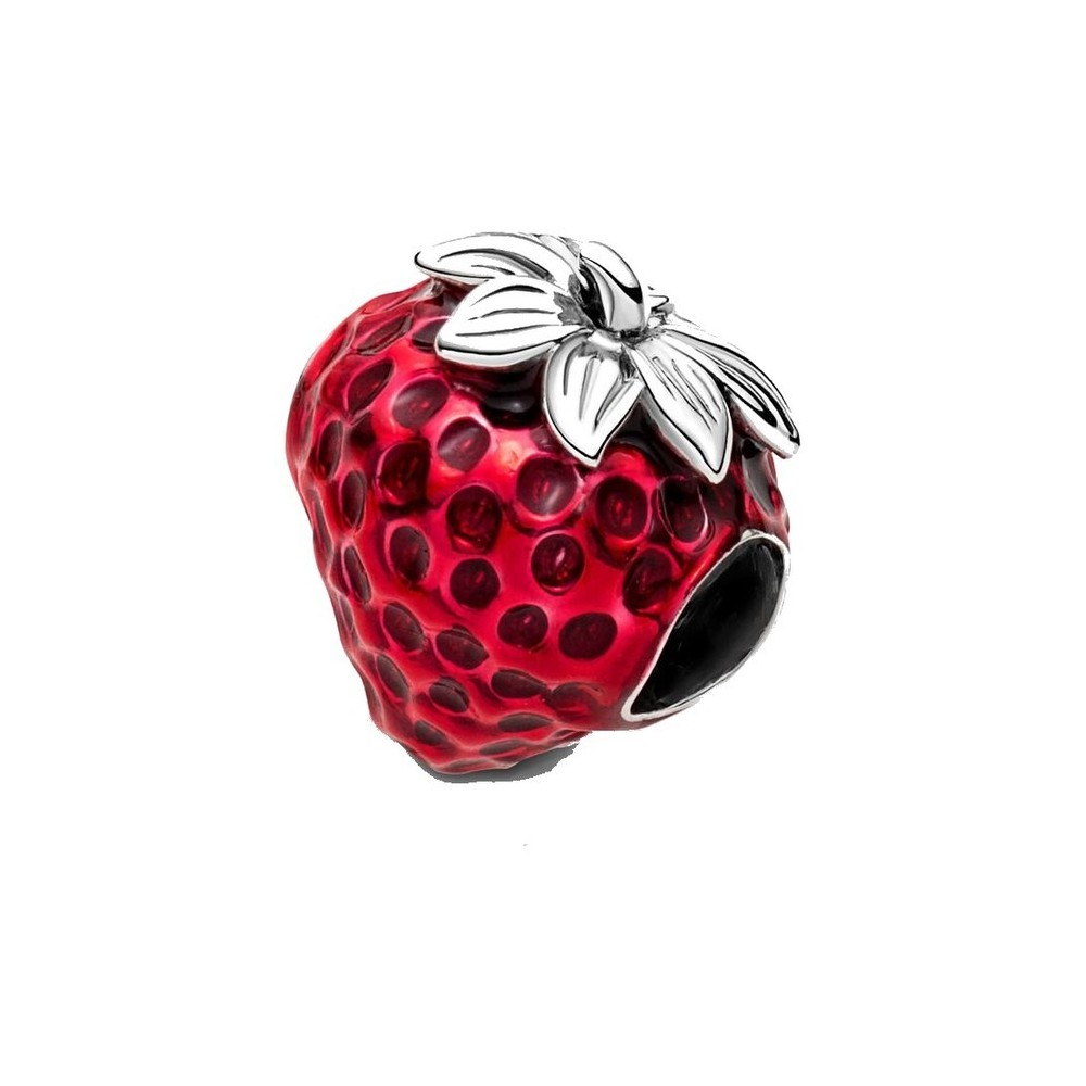 Ciondolo Pandora a fragola in argento sterling, rifinito a mano con smalto rosso trasparente e dettagli di semi realistici creati da rientranze scanalate sotto lo smalto.