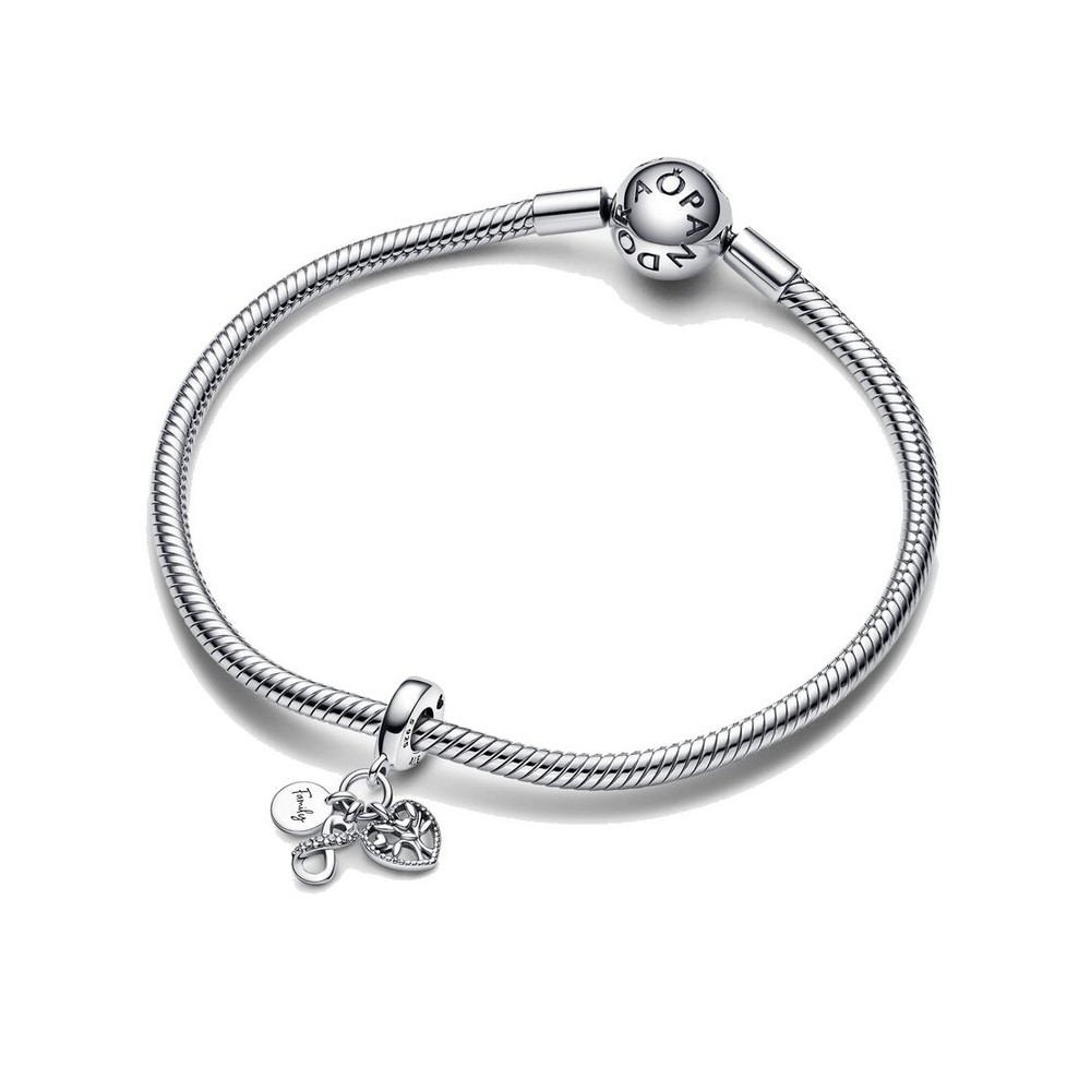 Realizzato in argento sterling 925, il charm pendente triplo Infinito e famiglia sfoggia un albero genealogico all'interno di un cuore con lavorazione openwork e un simbolo dell'infinito decorato da un pavé scintillante; tre potenti emblemi di vicinanza e amore eterno riuniti in un unico gioiello.