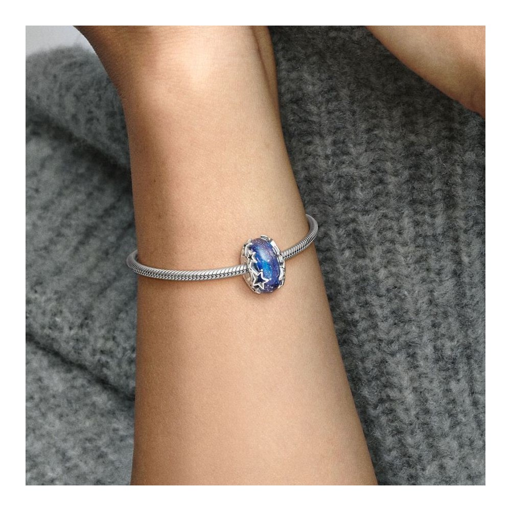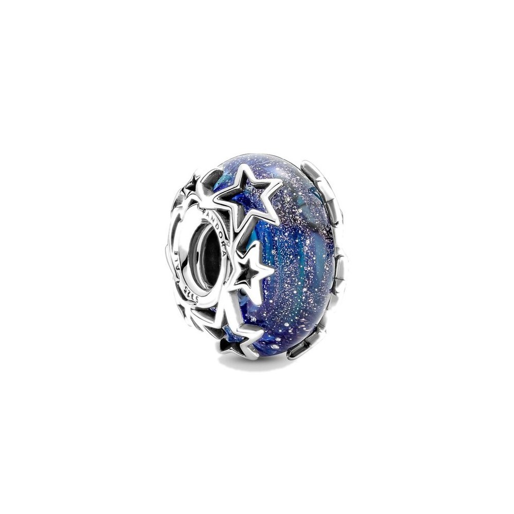 Charm in vetro di Murano Galassia blu e stelle riflette la bellezza del cielo notturno. Rifinito a mano e realizzato in argento sterling 925, il charm ispirato alla galassia presenta vetro di Murano blu scintillante circondato da stelle intagliate asimmetriche di dimensioni diverse in argento. Indossa il charm per rimanere legata alla forza delle stelle e dei pianeti