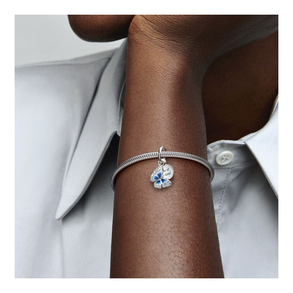 Il charm pendente doppio Farfalla blu e messaggio. Decorato da ali dipinte a mano e pietre di zirconia cubica incolori con taglio brillante, il charm presenta anche un medaglione in argento sterling 925 con il messaggio “One of a kind” (Unica). Proprio come le farfalle vere, ogni charm è assolutamente unico.