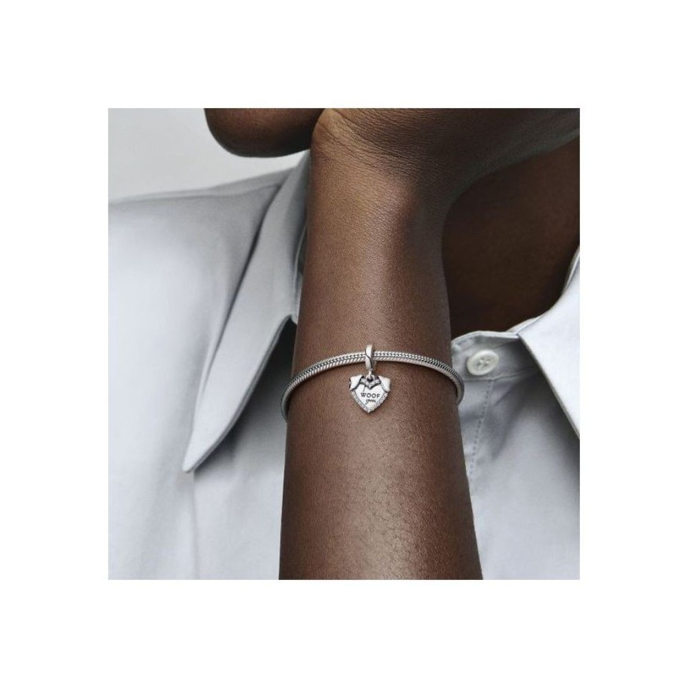 Charm Pandora a forma di cuore con graziose orecchie del vostro amato cagnolino realizzate in argento sterling contornato di zirconi e con al centro incisa la scritta I Woof you