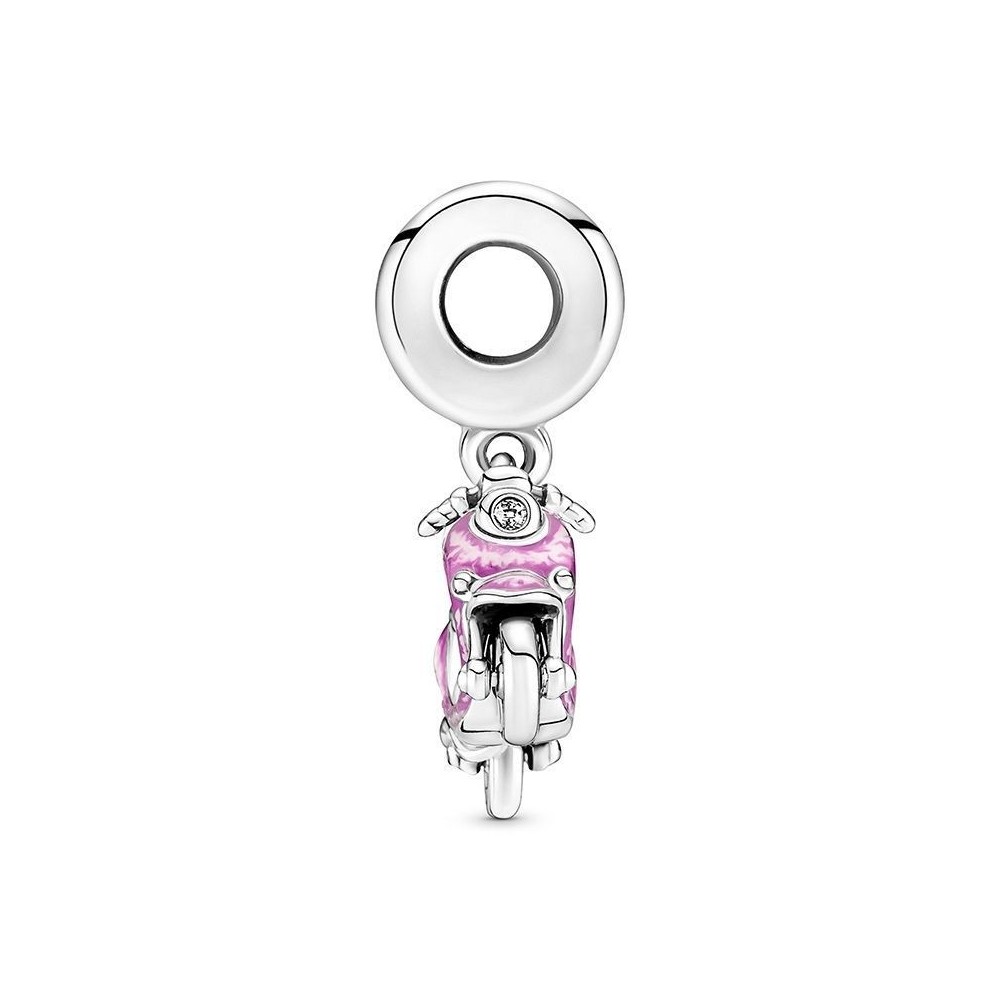 Il charm pendente Scooter rosa è realizzato in argento sterling con smalto applicato a mano ed è animato da dettagli come ruote che girano e motivi a fuoco. Un casco poggia sul sedile e presenta due file di microperline e il monogramma Pandora su entrambi i lati e un piccolo zircone dalla parte davanti che rappresenta il faretto. Porta questo charm pendente come promemoria dei luoghi che hai visitato o che sono nella tua lista dei desideri