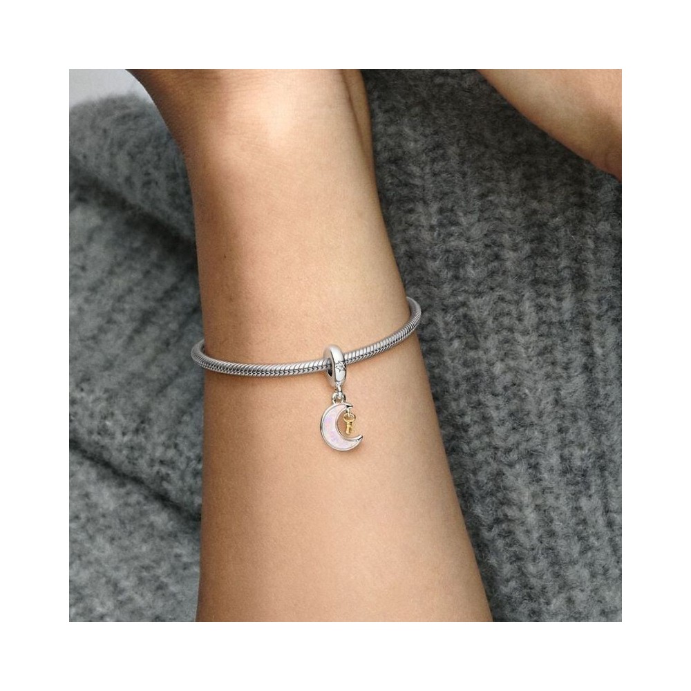 Charm Pandora Pendente Chiave della Luna realizzato in Argento Sterling 925. Il charm presenta un opale rosa creato in laboratorio a forma di luna. Dalla punta superiore della luna pende una chiave nell'esclusiva lega metallica placcata oro 14k, creando un accostamento di tonalità diverse. Sul retro è inciso il messaggio Believe in yourself (Credi in te).