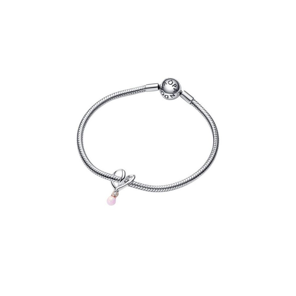 Charm Mamma, Nessuna Come Te della collezione Moments. Questo charm presenta un cuore in Argento Sterling 925 formato da linee morbide che si avvolge intorno al bracciale o alla base per charm. Due incisioni, There is no one like you (Non c'è nessuno come te) e Mum (Mamma), con la u di Mum che ha la forma di un cuore, aggiungono un tocco romantico. Il charm è completato da un piccolo pendente nell'esclusiva lega metallica placcata oro rosa 14k decorato da un opale rosa rotondo creato in laboratorio, che rappresenta la bellezza della maternità.