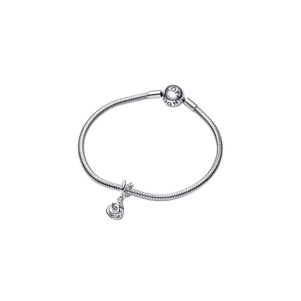 Charm Pendente Rosa della collezione Moments realizzato in Argento Sterling 925, il charm rappresenta una rosa in fiore con petali sovrapposti. Il retro della rosa è leggermente convesso e lucido. L'anello di congiunzione è costituito da una linea di Argento Sterling 925 che si avvolge in un unico anello e rappresenta il gambo della rosa, con piccole spine in rilievo