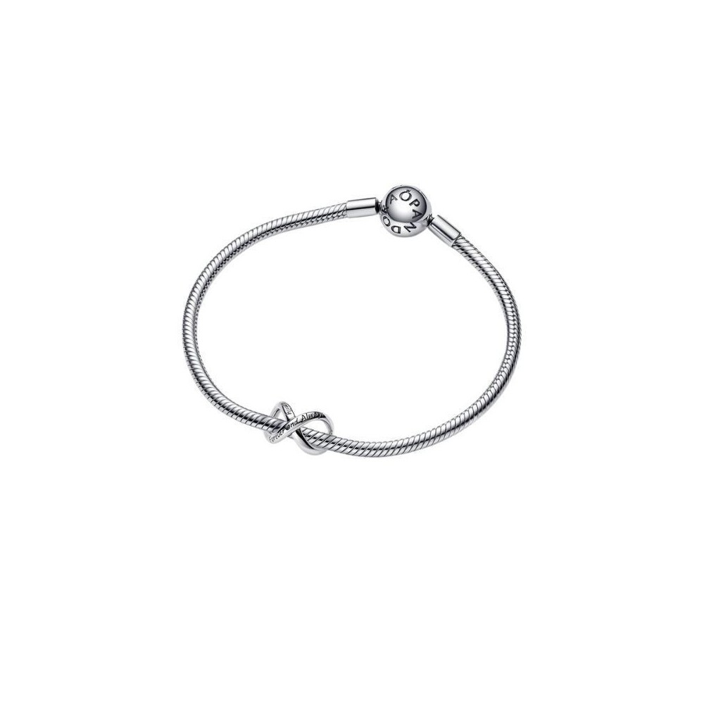 Charm Sempre e Per Sempre della collezione Moments. Una linea di Argento Sterling 925 forma il simbolo dell'infinito che si avvolge intorno al bracciale o alla base per charm. Caratterizzato dalle incisioni Family (Famiglia) e Forever and Always (Sempre e per sempre), questo charm Pandora ispirato all'infinito celebra l'amore eterno per la tua famiglia.
