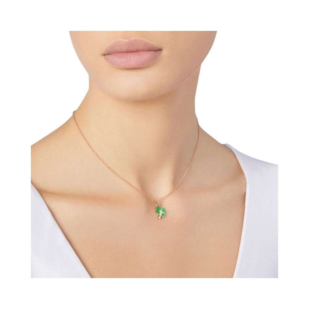 Ciondolo Dodo quadrifoglio in oro rosa 9K e smalto cattedrale verde. Cordino nero incluso.