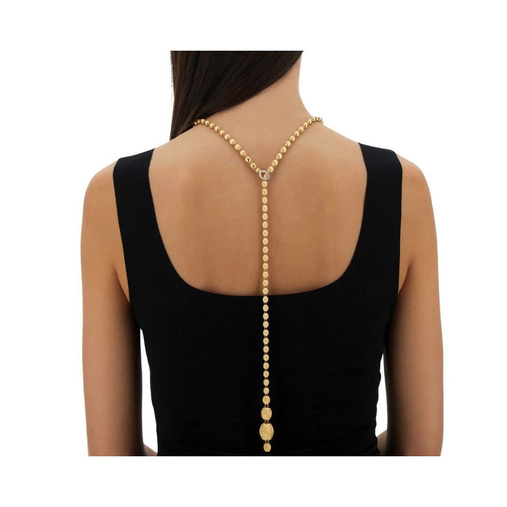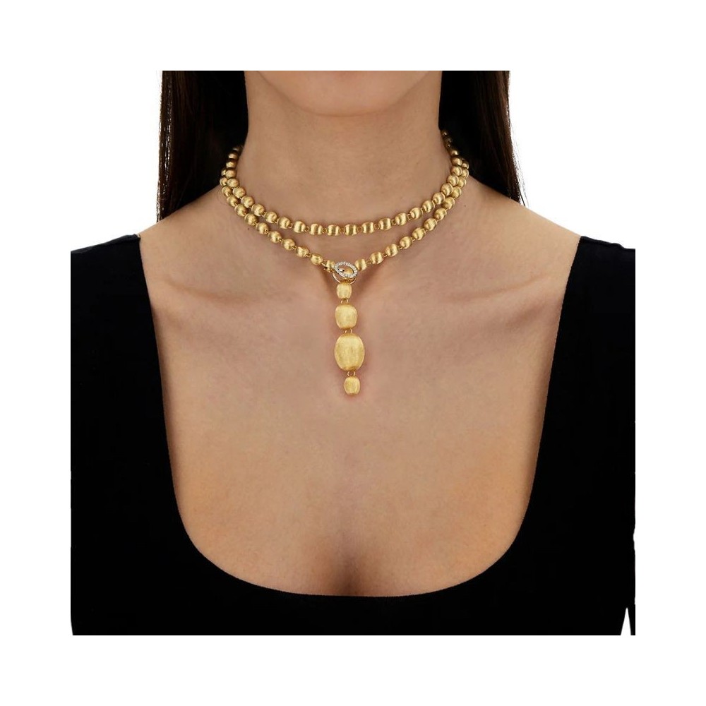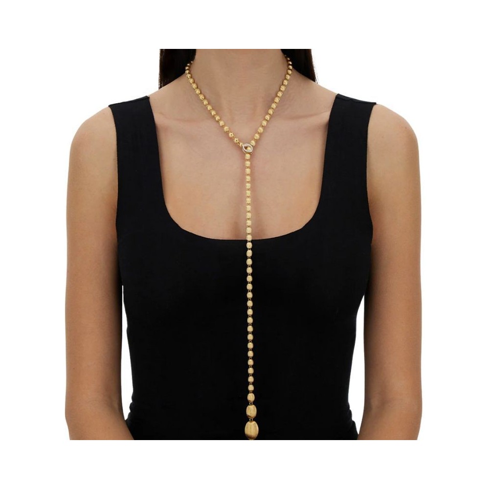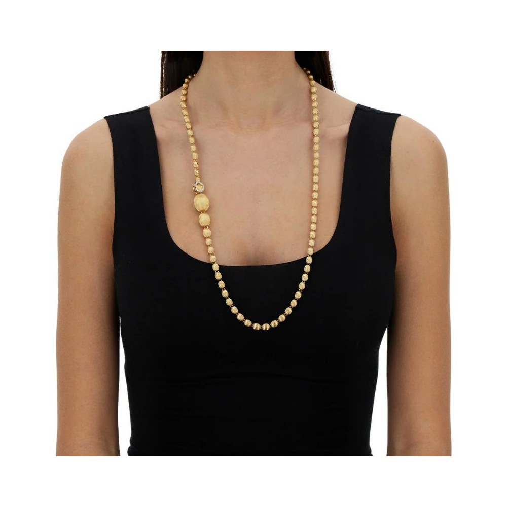 Ecco la collana di perle secondo Nanis: boules in oro 18 carati incise a mano una ad una, che culminano in una chiusura di brillanti pronta ad abbracciare ognuna delle boule di questo gioiello, aprendolo alle sue infinte possibilità. Questo filo di perle d’oro potrà infatti diventare un sensuale choker, ma anche una classica chanel, o un trasgressivo lariat. Interpretatela a seconda del vostro look e della vostra personalità.DIAMANTI:- Peso (totale): 0.25 CT- Purezza: VS- Colore: G- Taglio: brillante rotondo-Lunghezza 80,00 cm indossata lunga