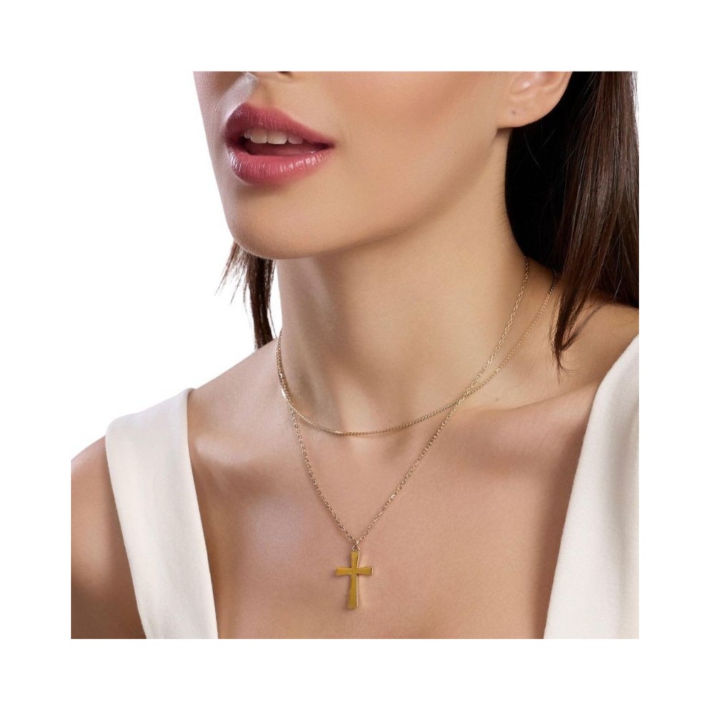 Girocollo regolabile in acciaio dorato con catene serpentina e forzatina diamantata, con pendente croce.• Dimensione catena serpentina: 1,3 mm• Dimensione catena forzatina: 1,8 mm• Dimensione croce: 17,5x25 mm• Misura regolabile, lunghezza da 38 a 43 cm• Materiale: Acciaio 316L, PVD giallo