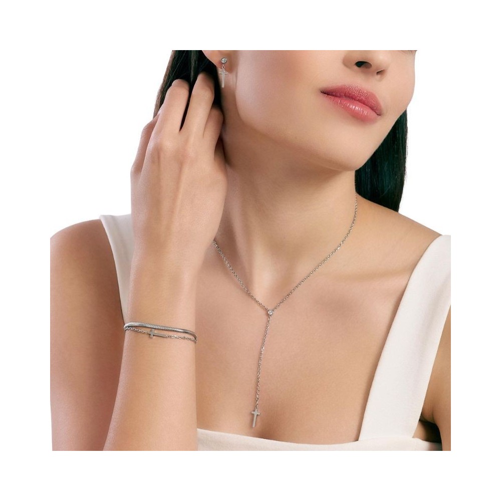 Girocollo regolabile in acciaio con catena forzatina diamantata, pendente croce e cristallo.• Dimensione croce: 6,6x14 mm• Diametro cristallo: 3 mm• Misura regolabile, lunghezza da 40 a 45 cm• Materiale: Acciaio 316L, Cristallo
