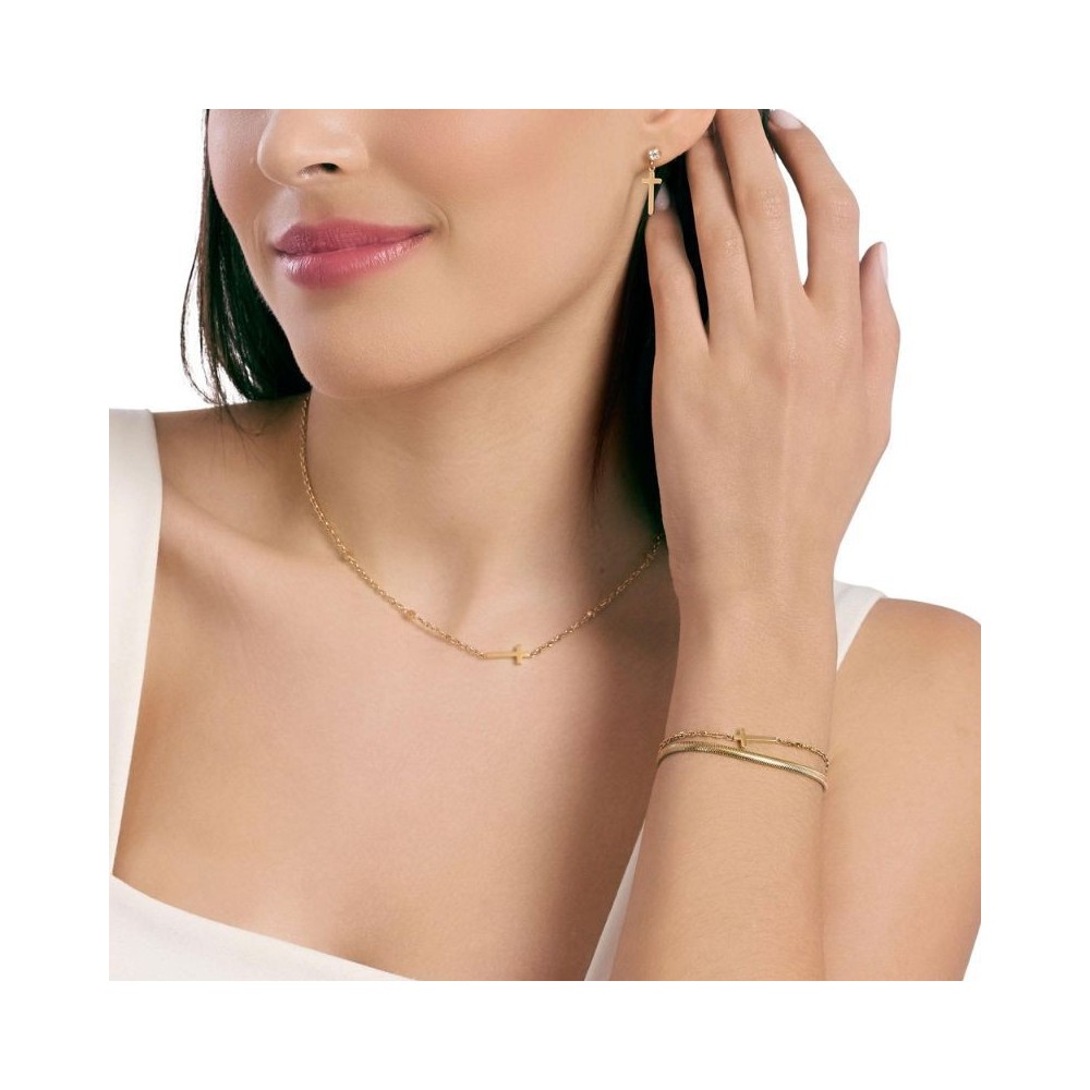 Girocollo regolabile in acciaio dorato con catena forzatina diamantata e croce.• Dimensione croce: 14x6,6 mm• Diametro cristalli: 2 mm• Misura regolabile, lunghezza da 38 a 43 cm• Materiale: Acciaio 316L, PVD giallo, Cristalli