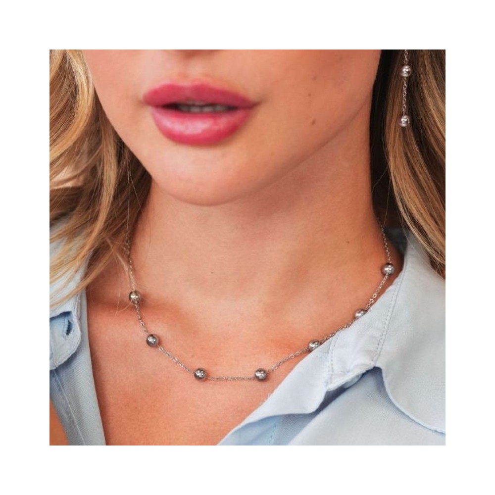 Collana girocollo in acciaio rodiato con centrale composto da 7 intercalari a forma di boules.Misura: lunghezza cm 40 estendibile fino a cm 45Dimensione: boule cm 0,5x0,5