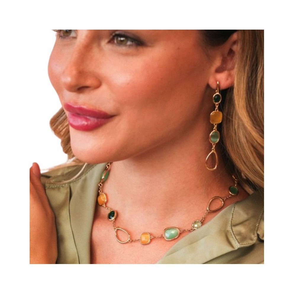 Girocollo placcato oro giallo composta da cristalli taglio briolette di colore smeraldo, cristalli, taglio cabochon, di colore giallo e cristalli di colore verde chiaro, intervallati da un modulo a goccia.Misure: lunghezza cm 39 estendibile fino a cm 44,5Dimensione: cristalli cm 1,5 e cm 1Chiusura: con moschettone