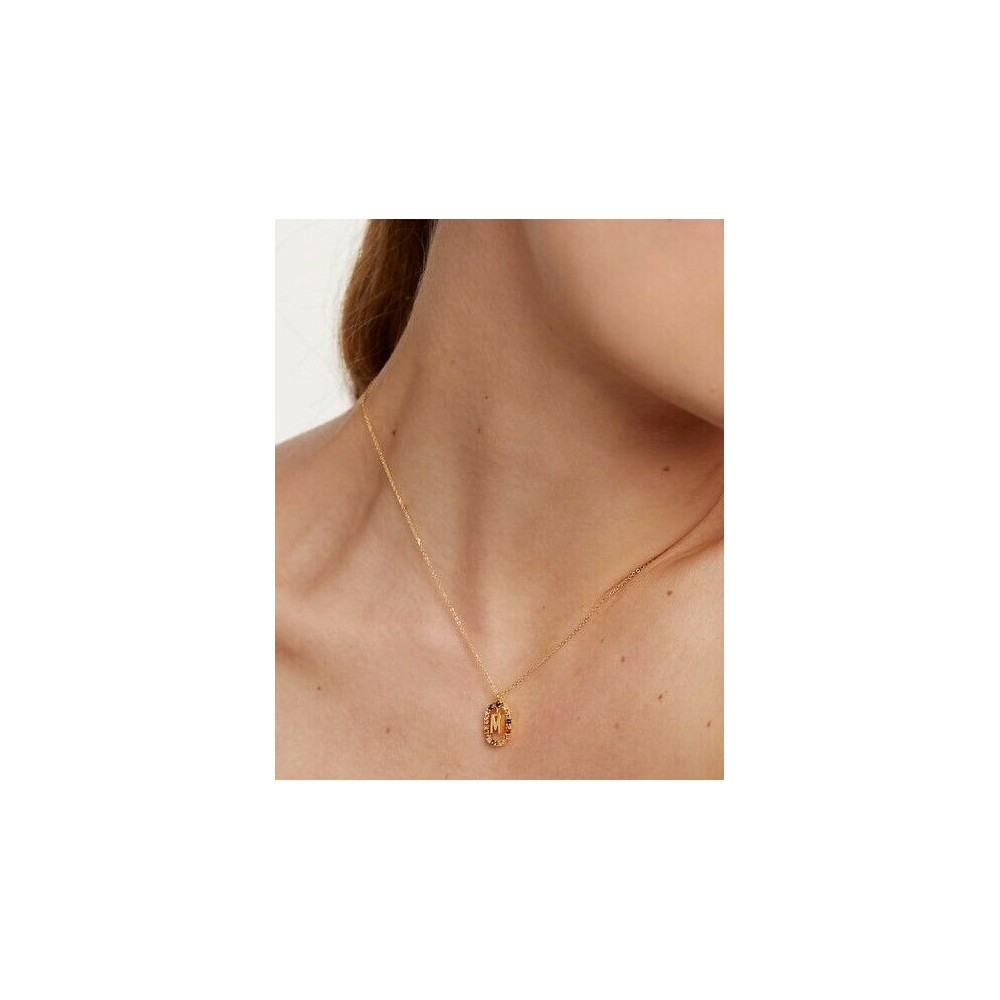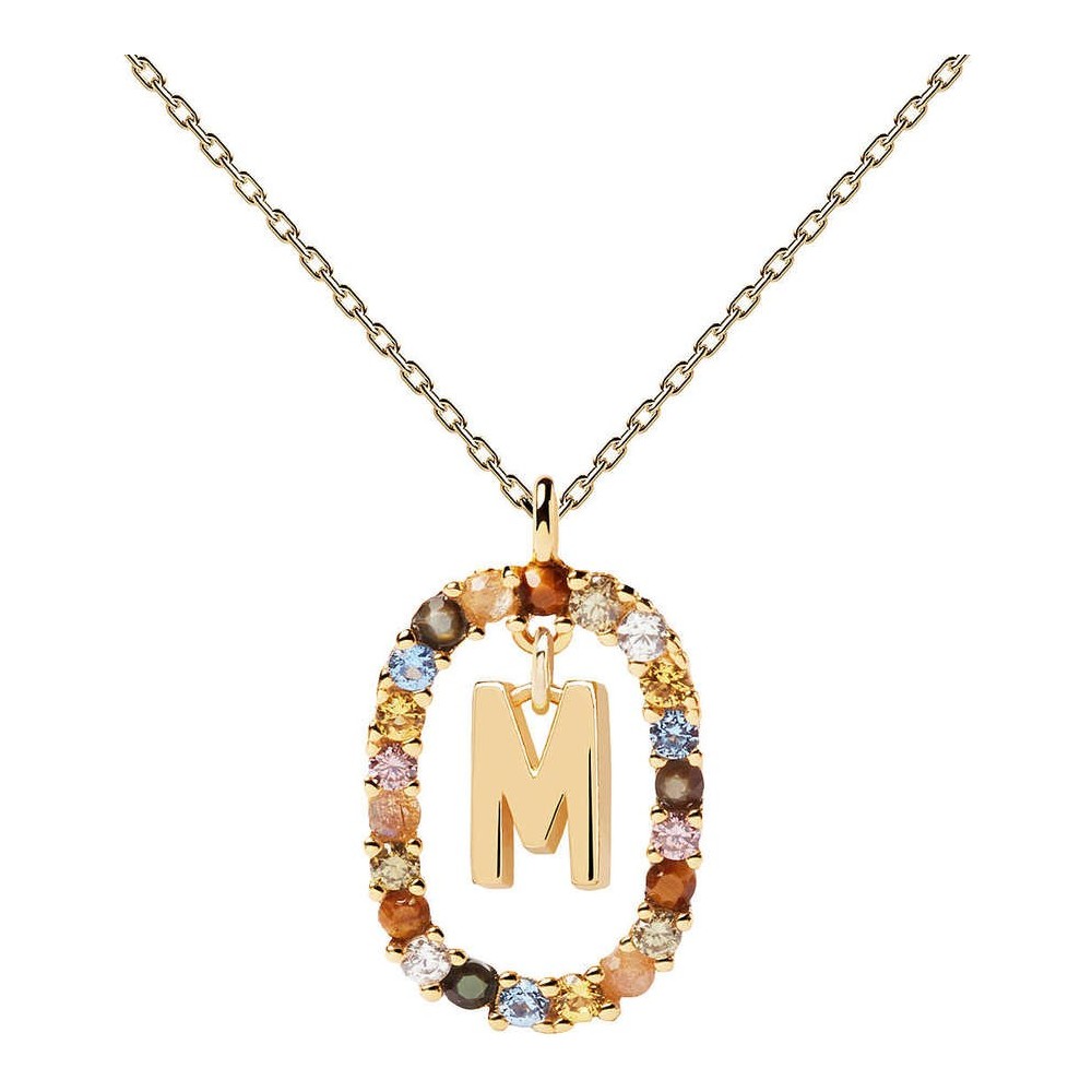 Collana PdPaola con lettera M in Argento 925% placcato in oro 18k con pietre di occhio di tigre, labradorite, madreperla e cristalli colorati. Chiusura a moschettone regolabile da 40 a 50 cm, Diametro delle pietre: 1,5 mm, Dimensioni dell'ovale: 10,5 x 15 mm, Altezza lettera frontale: 6,5 mm, Spessore della lettera: 3 mm, Peso: 2,5 g