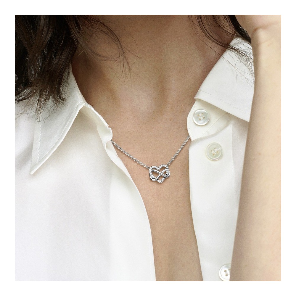 Collana Pandora Sparkling Infinity Heart Collier. Realizzato in argento sterling con pietre di zirconia cubica chiare. Il ciondolo è fissato alla catena, che è regolabile a tre diverse lunghezze da 43 a 50 cm