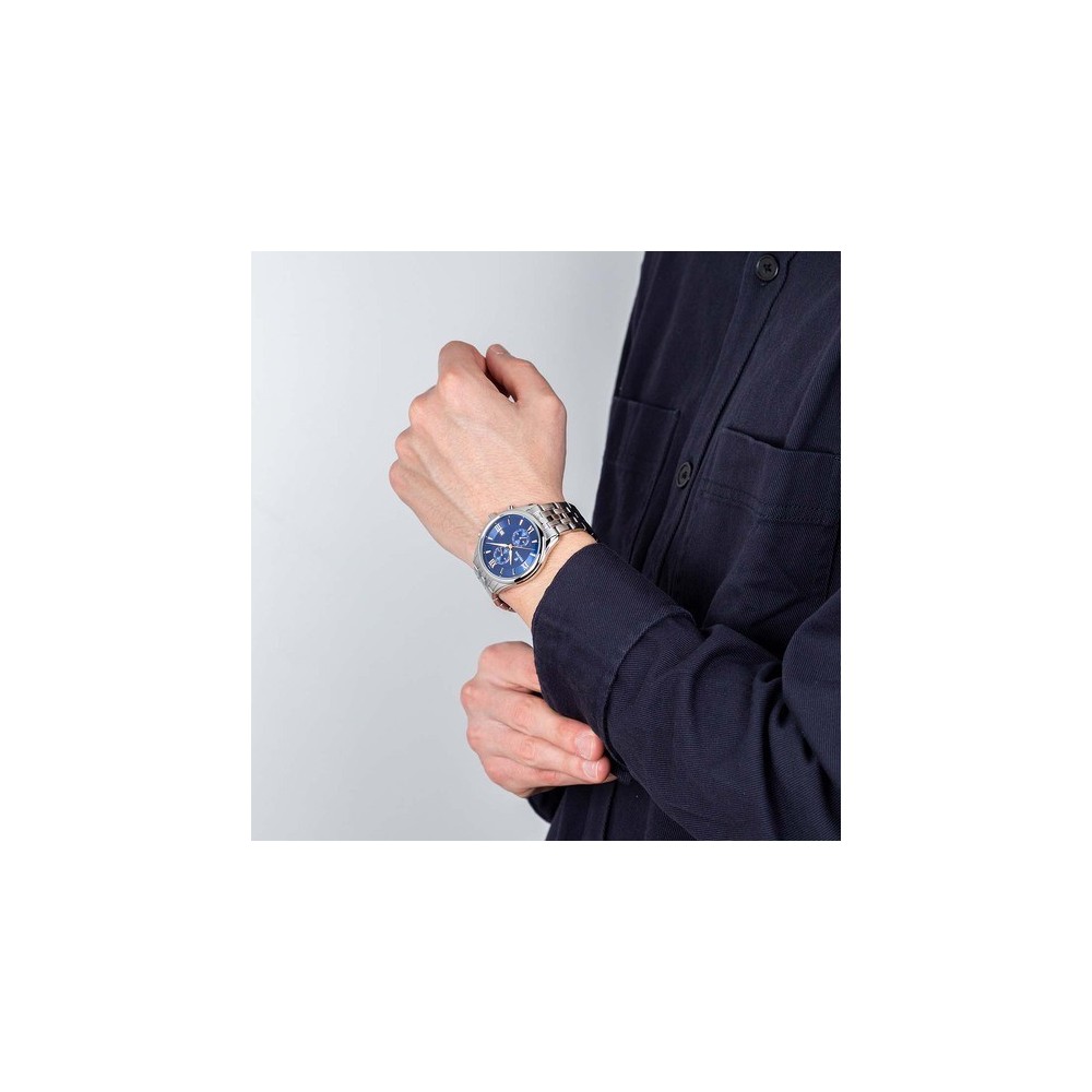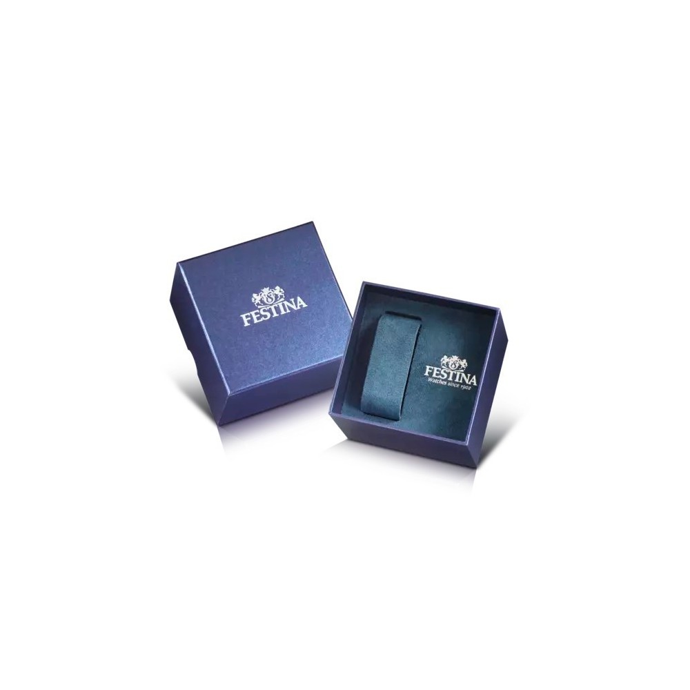 Orologio Festina da uomo con movimento al quarzo e funzioni di cronografo.Cassa in acciaio inox dal diametro di 42 mm con quadrante blu, indici alternati color oro e fatario a ore 3. Cinturino in acciaio anallergico; chiusura deployante con pulsanti. Resistente all'acqua fino a 30 metri di profondità.