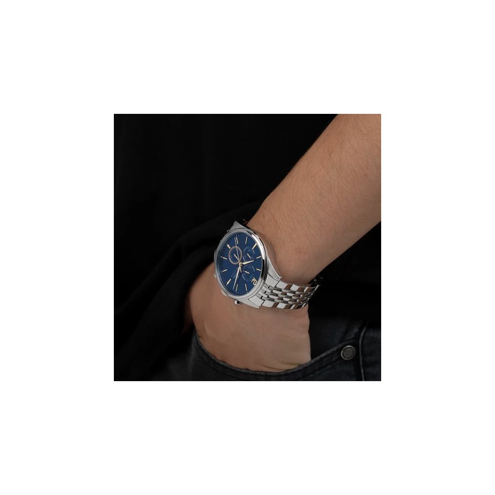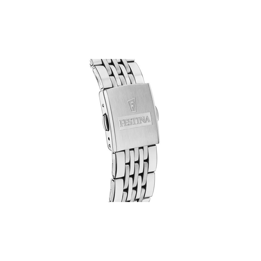 Orologio Festina Timeless da uomo 41,5 mm con cassa in Acciaio Inossidabile 316l, spessore della cassa 10,4 mm, vetro minerale, colore del quadrante blu con lancette oro, movimento al quarzo, cinturino in acciaio colore grigio e chiusura deployante. Impermiabile fino a 5 bar.