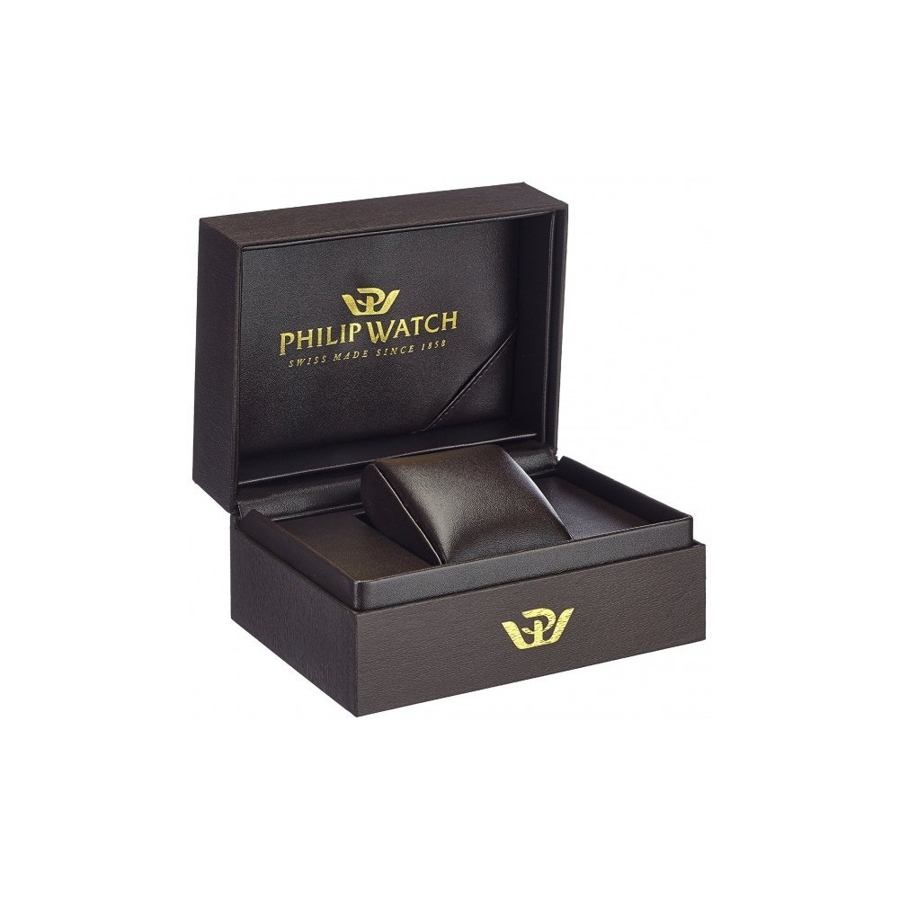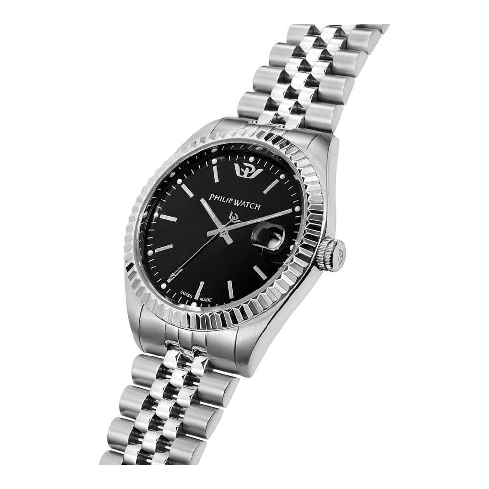 Orologio Philip Watch con cassa rotonda in acciaio con finitura lucida e satinata del diametro di 39 mm. Il cinturino è realizzato in acciaio di colore argento con chiusura con fibbia doppia. Il quadrante è di colore nero con vetro zaffiro. L'orologio è provvisto di datario. Il movimento è al quarzo. La resistenza all'acqua è di 10 atm.