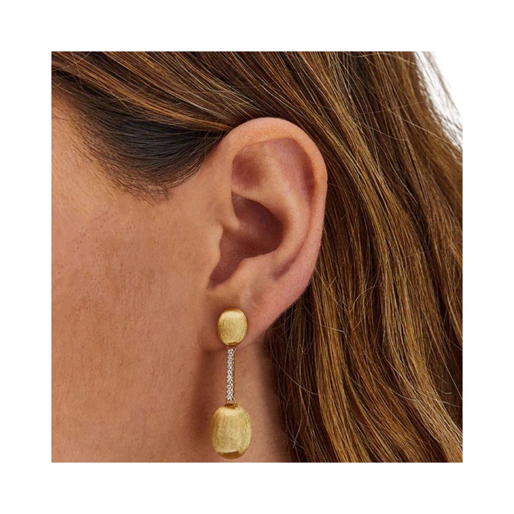 La delicatezza dell'eleganza incontra il talento di questi orecchini scintillanti che sposano i diamanti a due boules in oro 18 kt, incise a mano dai nostri artigiani. Laura, che testa ogni sua creazione, ha poi ideato per questi orecchini delle speciali farfalline dotate di una lamella pensata per sostenere la parte superiore dell’orecchino, garantendone una perfetta vestibilità.DIAMANTI:- Peso (totale): 0.15 CT- Purezza: VS- Colore: G- Taglio: brillante rotondo