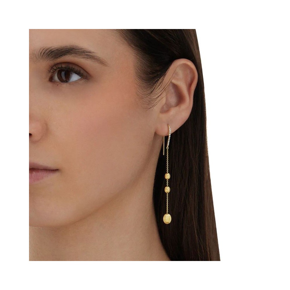 Gocce di pioggia dorata, questi orecchini in oro 18 kt e diamanti daranno un tocco di classe e di movimento al vostro look.DIAMANTI:- Peso (totale): 0.10 CT- Purezza: VS- Colore: G- Taglio: brillante rotondo-Misura: 73mm