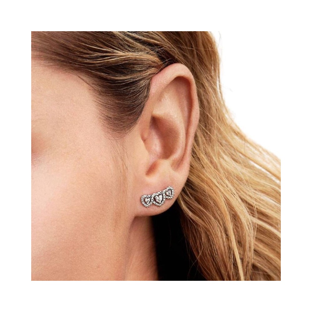 Per il passato, il presente e il futuro. Questi orecchini a lobo in Argento Sterling 925 sono decorati da tre pietre a forma di cuore collegate da un pavé di punti luce. Un simbolo luminoso dell’amore in tutte le sue fasi.