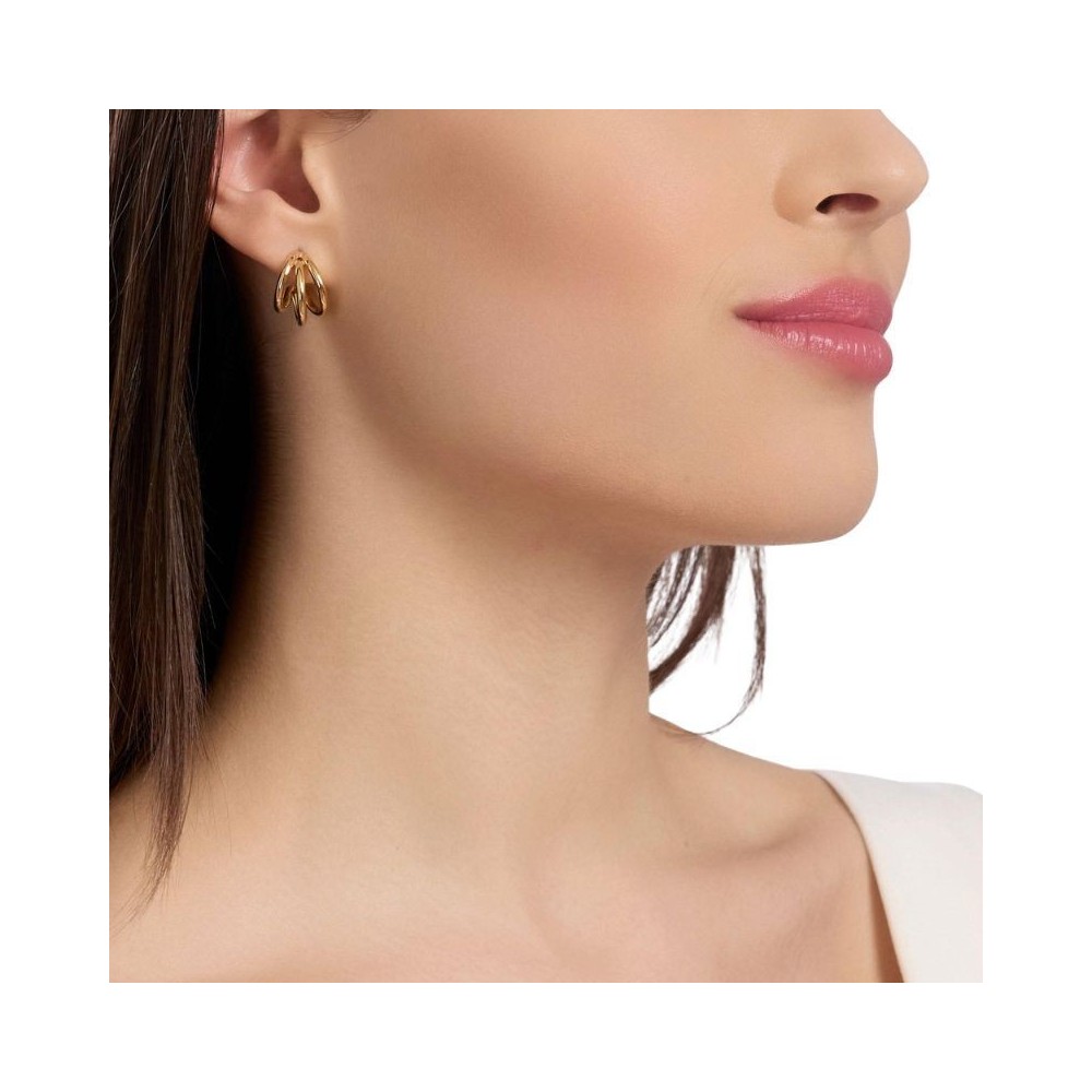 Orecchini con semicerchi in acciaio dorato.• Diametro esterno: 14,8 mm• Diametro interno: 10,8 mm• Lunghezza totale dell'orecchino: 1,3 cm• Materiale: Acciaio 316L, PVD giallo