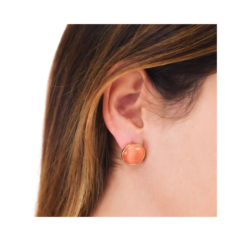 Orecchini a lobo, placcati oro giallo, con cristalli effetto cabochon di colore arancio scuro.Dimensione: cristallo cm 1,5Chiusura: a farfalla