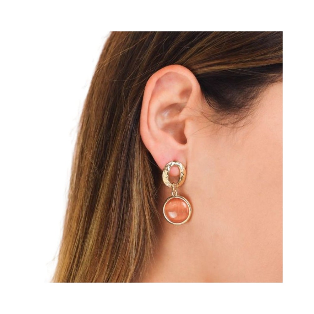 Orecchini pendenti, placcati oro, con cristalli effetto cabochon di colore arancio scuro e modulo circolare martellato.Dimensione: cristallo cm 1,5; lunghezza pendente cm 3,5Chiusura: a farfalla