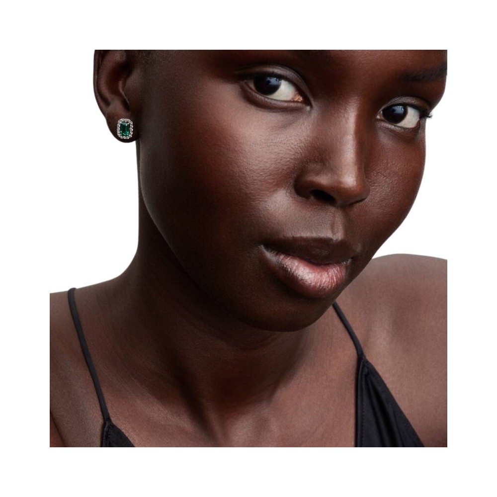 Immergiti nell’incanto del verde smeraldo. Questi orecchini a lobo in Argento Sterling 925 presentano una pietra centrale in rilievo circondata da un'aureola di pietre scintillanti incastonate a pavé; un gioiello classico e sofisticato ispirato ai tesori dei portagioie di un tempo.
