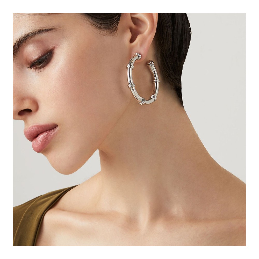 Orecchini Jackie di Giovanni Raspini, La lavorazione a canna vuota arricchita da coppie di anelli torniti e saldati sul gioiello, regala a questo bangle un aspetto lineare e di grande luminosità.