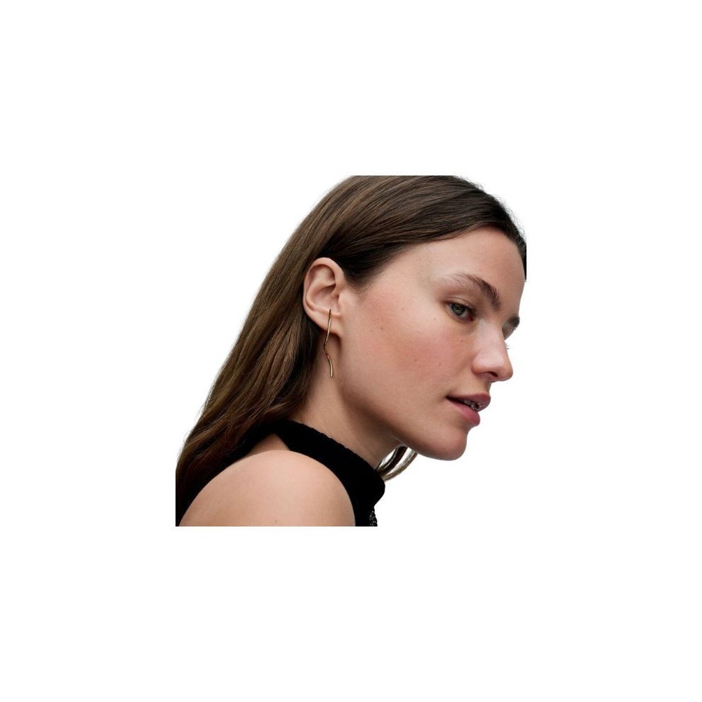 Ciascun orecchino, realizzato con placcatura Oro 14k, presenta un filo ondulato verticale con profilo arrotondato e più sottile verso ciascuna estremità. L'estremità superiore dell’orecchino si estende leggermente al di sopra del lobo dell'orecchio. Il design è speculare, c'è quindi una differenza tra l'orecchino sinistro e il destro.